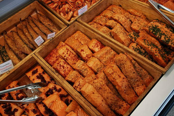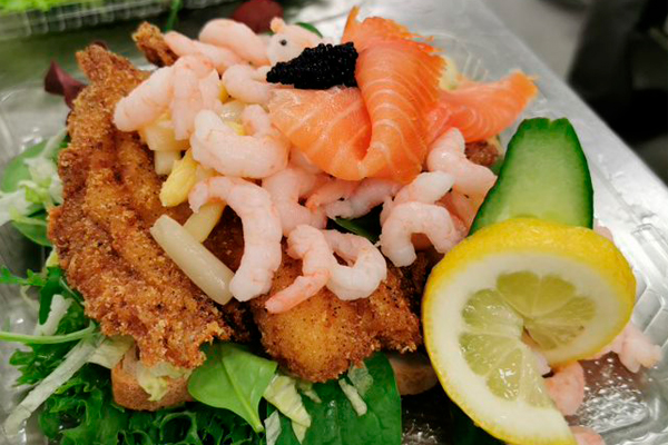Sortimentet byder på alt fra friskfangede fisk og skaldyr til røgvarer, salater og lækre specialiteter fra udvalgte leverandører. Vi tilbyder også kød og udskæringer af dyr fra vores frilandslandbrug, Troldhøjgaard – bl.a. vores frilandsgrise.